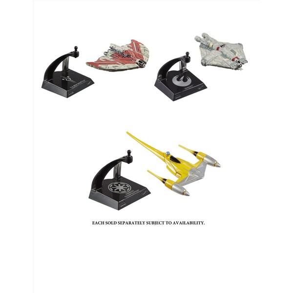 The Hot Wheels Star Wars Starships Select collection features premium designs and packaging for enhanced collectability and massive appeal. Each ship is 4.5 to 6 in. in size slightly larger than the traditional Hot Wheels vehicle and some have movable parts to add to their authenticity. The sleek and clean design of the packaging makes it display-ready while still in the box for those who prefer to unbox it includes a stand that has the ship's affiliation logo and name. Collectors will want the whole fleet that features ships spanning the entire franchise. Each sold separately subject to availability. Colors decorations and styles may vary.