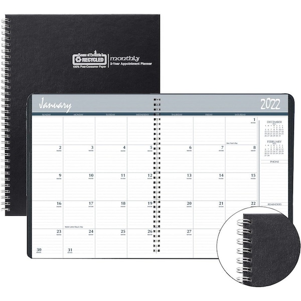 Unique two-year monthly planner with a durable hard cover folds over to create a sturdy writing surface. Dated planning pages range 24 months from January to December. Two-page-per-month spreads include large, ruled daily blocks (2-1/8" x 1-7/8") for detailed notes, holidays, count of days/days remaining, Sunday-through-Saturday scheduling, a ruled notes area along the side, and past and future months reference near the top right corner. Nonrefillable planner is printed with soy ink on paper made with a high percentage of recycled material. Strong, recycled wire binding firmly keeps the planner intact throughout the year.