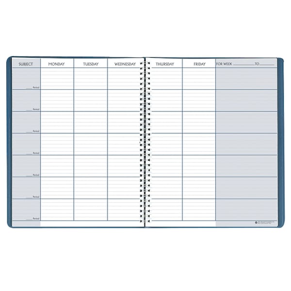 Includes seating chart, term program, test and attendance records. One week per two-page spread. 40 weeks / 7 periods. Days of the week are across the top and periods down the right hand side. Blue embossed simulated leather cover, non-refillable. Measures: 8-1/2" x 11". Printed on 100% post-consumer recycled paper with soy ink. Sold as a pack of 2 planners.
