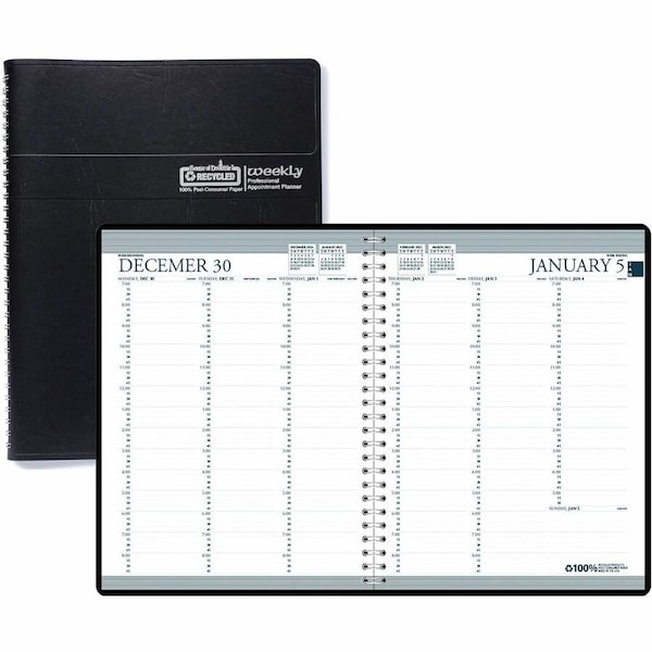 Professional weekly planner features an embossed, simulated leather cover for a professional look and vertical planning that ranges 12 months from January to December. Strong wire binding firmly keeps the planner intact throughout the year. Printed monthly indicators help you quickly find the date you need, Two-page-per-week spreads include ruled daily columns, half-hourly appointment times from 7 AM to 8:45 PM on weekdays and 7 AM to 5:30 PM on Saturday, Monday-through-Sunday scheduling, count of days/days remaining, a ruled notes section and past, current and two future months reference. Nonrefillable planner also features a three-year calendar reference page for long-range planning and additional page with important holiday dates for three years in list form. Paper is made with a high percentage of recycled material.