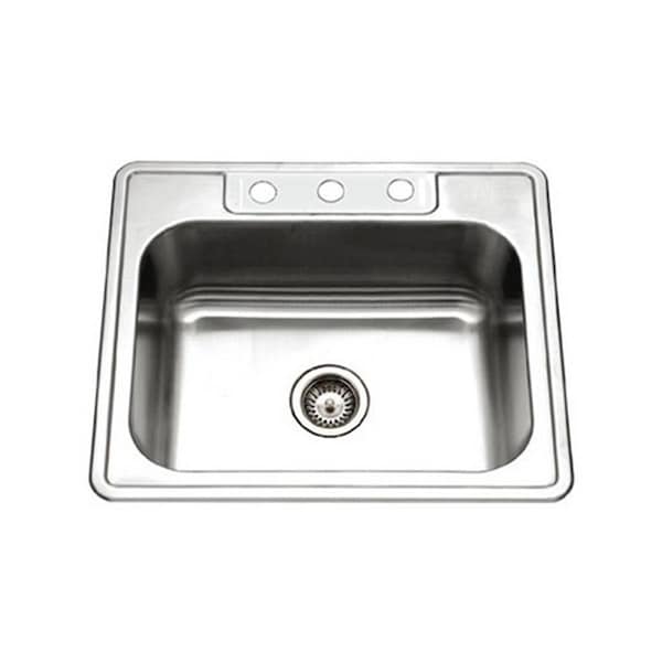 The Houzer Glowtone Series Topmount Single Bowl Kitchen Sink is designed to bring extraordinary value to everyday application. The perfect combination of ecoNomy style and convenience. This Houzer is made of 20-gauge stainless steel and features 3 faucet mounting holes a lustrous satin finish with highlighted rim that is easy to clean and maintain self-rimming edges StoneGuard undercoating over super silencer pad. Features -Topmount Single Bowl -Lustrous Satin Finish with highlighted rim Specifications - Material: Stainless Steel - Drain Placement: Center - Faucet Holes: 3 - Faucet Hole Size: 1.5 - Minimum Cabinet Size: Fits 30in. cabinet - Number of Basins: 1 - Faucet Included: No - Basin Rack Included: No - Basket Strainer Included: No - Colander Included: No - Cutting Board Included: No - Single Basin Dimensions: 21in. L x 15.75in. W x 8in. D - Installation Type: Topmount - Sound Dampening: Yes - Gauge: 20 - Country of Origin: South Korea - ADA Compliant: No - Approved For Commerical Use: No - Collection Name: Glowtone - Theme - Style: Traditional - Warranty Term: Limited Lifetime - Dimension: 22in. L x 25in. W x 8in. D