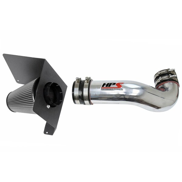 HPS polish performance cold air intake with heat shield part number 827-622P for 2007-2008 GMC Yukon 4.8L 5.3L 6.0L 6.2L V8 offers a free-flowing 4 in mandrel-bent aluminum tube induction system designed to improve throttle response and produce dyno proven performance gains +16.9 Whp horsepower, +18.5 Ft/lbs torque while maintaining safe air fuel ratio. The heavy duty powder coated steel heat shield included in the kit blocks out the heat from engine and maximize the cooling effect. The included installation manual has clear pictures and instructions to guide the installer throughout the whole process. The kit does NOT require tuning and does not trigger CEL light. No modification is required during the installation. HPS light weight 4 in mandrel-bent aluminum alloy piping replace the stock restrictive air box and optimize the air flow with long lasting durability. HPS performance cold air intake kit features HPS signature race proven reinforced silicone hoses and industrial grade 100% stainless steel T-bolt clamps which ensures reliability, even during the most extreme driving conditions. The All-New HPS Performance Air Filters are made in the United State and are designed with performance in mind, delivering excellent filtration without sacrificing air flow. Washable and reusable. NOT CARB Complaint. Vehicle Application: 2007-2008 GMC Yukon 4.8L 5.3L 6.0L 6.2L V8