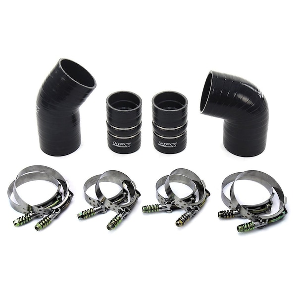 This HPS 4-ply reinforced silicone intercooler boot kit replaces the stock OEM intercooler boots that are known to weaken and fail over time. Made with premium quality oil-resistant fluorolined silicone and crafted with performance driven design, this boot kit can withstand high boost pressure and ultra high temperature conditions under the hood through a wide range of driving conditions. Mitigate the risk of boost leak with boots that can withstand over 100 PSI. This HPS silicone boot kit is designed using OEM parts to ensure a perfect fit. Avoid expensive towing fees by upgrading your truck with an HPS Silicone Intercooler Boot Kit. Maximum temperature rating: 500 degrees Fahrenheit. Heavy duty stainless steel spring loaded T-bolt clamps are included for easy installation.