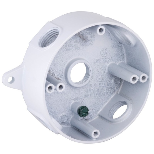 For use in branch circuit wiring in wet, damp or dry locations. Designed for use as a weatherproof junction box and used with Bell round cluster covers and round lamp holder combinations. Die-cast aluminum construction. Powder coat finish. Reinforced connector outlets. Cast-in mounting lugs, four closure plugs included and installed ground screw. 16.1 cu-in capacity. Six 10-24 tapped holes. 4 in Dia x 1-1/2 in D. UL listed.