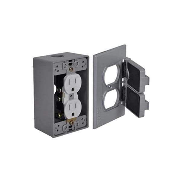 Master Electrician, Gray, Duplex Outlet Kit, Contains 15A, 125V Receptacle, Rectangular Box, Cover Accessories, Clamshell Packaging