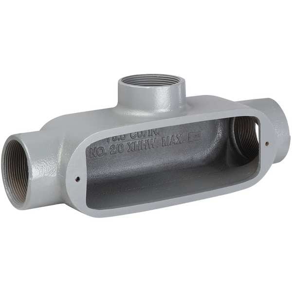 Conduit Outlet Body, Overall Width 3 in, Overall Height 2 in, Overall Length 7 in, Trade Size 3/4 in, Compatible Conduit Trade Size 3/4 in, Hub Size 3/4 in, Compatible Cover OL-20, Aluminum, O, Compatible Conduit Type IMC, RMC, Back Type Flat, Body Capacity 7 cu in, Body Style T, Body Type Conduit Outlet Body, Color Gray, Connection Orientation Multi-Angle, Connection Type Threaded, Finish Powder Coated, For Use With IMC, RMC, Hazardous Location Yes