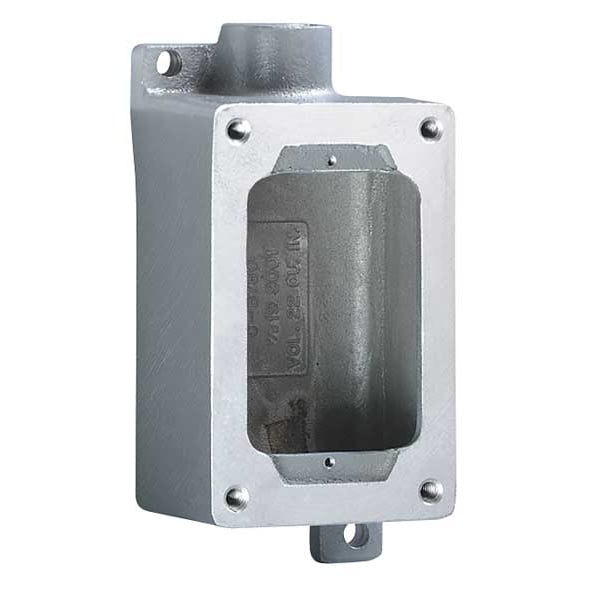 Device Box, Box Type 1-Gang, Number of Gangs 1, Bracket Type Lugs, Material Aluminum, Clamp Type Not Applicable, Number of Hubs 1, Rated Hazardous Location, Color Gray, Standards CSA, UL Listed