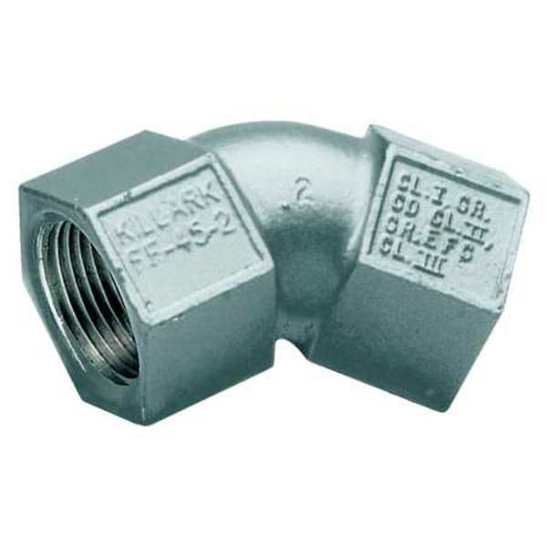Elbow, 45 Degrees, Thread Gender Female to Female, Trade Size 1/2 in, Compatible Conduit Type IMC, Threaded RMC, Compatible Conduit Trade Size 1/2 in, Ends - Hazardous Fittings 1/2 in FNPT x 1/2 in FNPT, Overall Length 2 3/8 in, Overall Height 3 in, Overall Width 2 in, Weight 0.15 lb, Aluminum, Finish Powder Coated, Hazardous Location Rating Class I, Division 1 and 2, Groups C, D, Class II, Division 1 and 2, Groups E, F, G, Class III, FF, For Use With IMC, Threaded Conduit