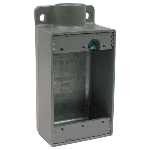 Electrical Box, Box Type FS, Number of Gangs 1, Bracket Type Lugs, Capacity 18 cu in, Material Aluminum, Clamp Type Not Applicable, Number of Hubs 1, Color Gray, Standards CSA, UL Listed