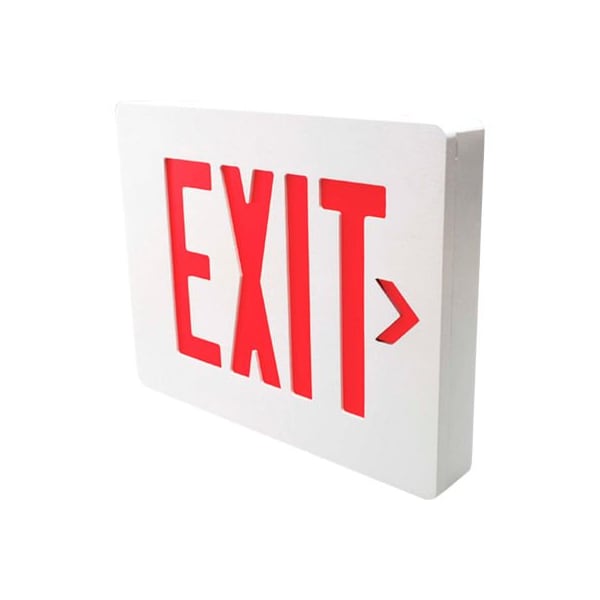 high-strength cast aluminum, 5-minute installation, white textured face & red letters, long-life led lamps, single-face, universal end/ceiling/wall mounting, 120/277v