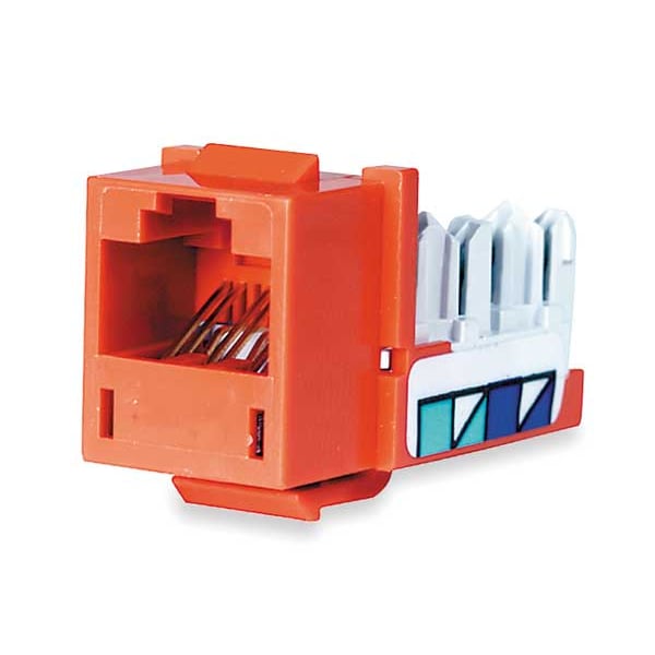 Modular Jack, Termination Type 1-Punch, Compatible Cable Performance Category 5e, Compatible Connector Type Not Applicable, Color Orange, Compatible Number of Fibers Not Applicable, Compatible Wire Material Copper, RCA Insulator Color Orange, Number of Ports 1, Overall Depth 1 5/16 in, Overall Height 7/8 in, Overall Width 11/16 in, Standards ANSI/TIA/EIA-568, IEC 60512-99-002, RoHS Compliant, UL 1863, UL 2043