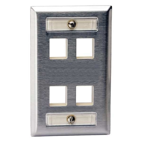 Wall Plate, Product Type Wall Plate, Wallplate Type Audio/Video, Color Gray, Compatible Connector Type Keystone Jack Modules, Number of Gangs 1, Outlet Orientation Vertical, Number of Ports 4, Compatible Cable Performance Category Not Applicable, Material Stainless Steel, Features Stamped Construction, Includes (2) Clear Label Covers, (2) Labels, Includes Mounting Hardware Yes, Overall Depth 1/4 in, Overall Height 4 1/2 in, Overall Width 2 3/4 in
