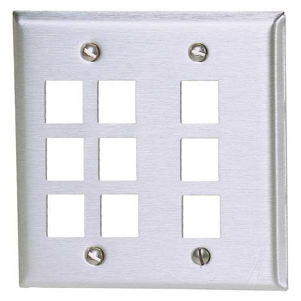 Wall Plate, Product Type Wall Plate, Wallplate Type Audio/Video, Color Gray, Compatible Connector Type Keystone Jack Modules, Number of Gangs 2, Outlet Orientation Vertical, Number of Ports 9, Compatible Cable Performance Category Not Applicable, Material Stainless Steel, Features Stamped Construction, Includes Plate and (4) Screws, Includes Mounting Hardware Yes, Overall Depth 3/8 in, Overall Height 4 1/2 in, Overall Width 4 1/2 in, Standards cUL Listed 1863, RoHS Compliant, UL Listed 1863