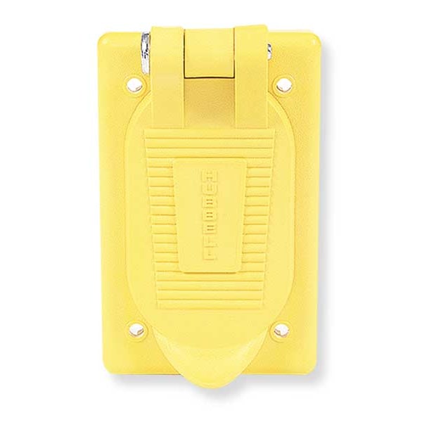 Weatherproof Cover, Mounting Box FS or FD Weatherproof Boxes, For Use With Duplex, GFCI, Surge Receptacles and STYLE LINE(R) Devices, and FS/FD Boxes, Mounting Orientation Vertical, Lid Style Self Closing, Number of Gangs 1, Gasket Material Neoprene, Cover Material Thermoplastic, Color Yellow, Height 4 9/16 in, Width 2 57/64 in, Standards CM, UL Listed, Includes Neoprene Gaskets, Screws, Stainless Steel