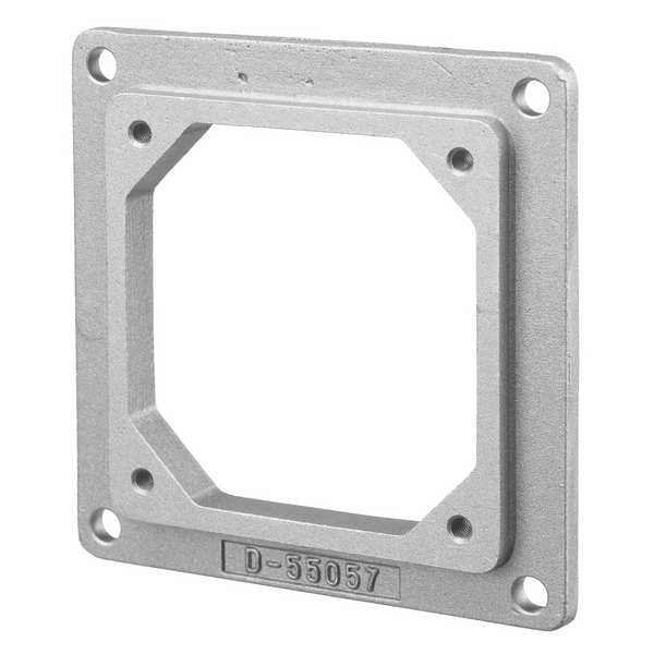 The HUBBELL Adapter Plate is a straight adapter plate constructed from cast aluminum with a metallic finish. Designed for use with the Receptacle Box 3D076, it provides a mounting option for electrical devices and is suitable for 60 Amp applications. The plate accepts one device and features mounting screws for installation.