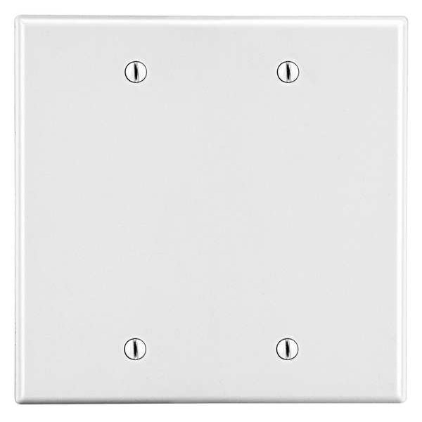 The HUBBELL Blank Box Mount Wall Plate is a 2-gang, non-metallic wall plate designed for use with receptacles. It features a blank face with no outlet or switch openings and mounts vertically over electrical boxes using screws. The wall plate provides extra coverage to conceal rough box openings and fits standard-sized installations.