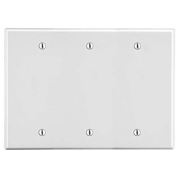 The HUBBELL Blank Box Mount Wall Plate is a 3-gang, non-metallic wall plate designed for use with receptacles. It features a blank face with no outlet or switch openings and mounts vertically over electrical boxes to provide coverage and conceal rough box openings. Constructed from plastic material, this wall plate has a satin surface and is compatible with standard installations where additional coverage may be needed.