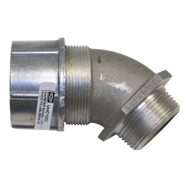 Liquid Tight Cord Connector, Cord Dia. Range 1.00 in to 1.13 in, Box Connection 1 1/4 in MNPT, Material - Cord Connector Aluminum, External Strain Relief Material No External Strain Relief, Gland Color Code No Code, Body Color - Cord Connector Silver, Number of Cords 1, Style - Connector 45 Degrees , Strain Relief Type No External Strain Relief, External Strain Relief Length No External Strain Relief, Length - Box to End of Connector 3 7/8 in, Insulated No