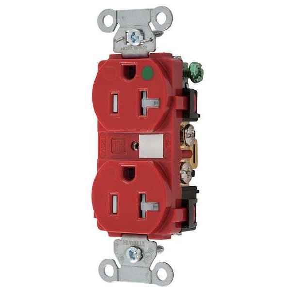 The HUBBELL 20A Duplex Receptacle 125VAC 5-20R RD is a traditional duplex electrical outlet suitable for use in environments requiring heavy-duty and hospital-grade receptacles. It features tamper-resistant shutters and is rated for 20 amps at 125 volts AC. The receptacle supports both back and side wiring methods, accommodates #12 to #10 AWG copper wire, and includes mounting hardware for flush installation.