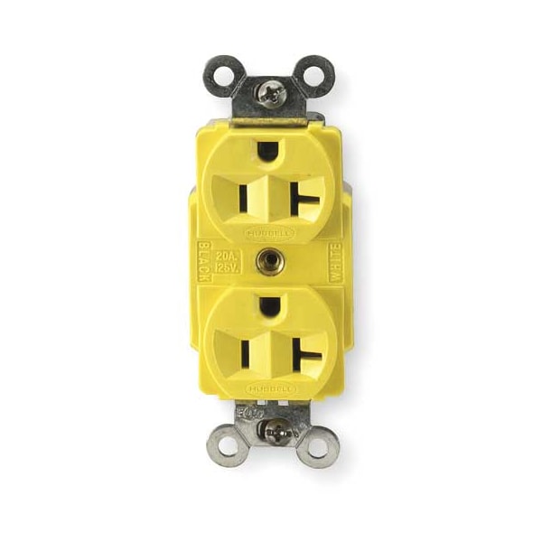 The HUBBELL 20A Duplex Receptacle 125VAC 5-20R YL is a duplex straight blade receptacle rated for use in specified environments. It features a construction includes materials resistant to corrosion with a yellow nylon face and deep body design, may be used in marine wiring devices and similar applications as specified by manufacturer. The receptacle supports both back and side wired screw terminals for flexible installation options and includes an integral ground strap for grounding.