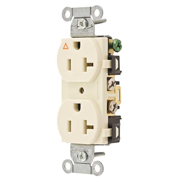 The HUBBELL 20A Duplex Receptacle 125VAC 5-20R Almond is a specification grade duplex outlet rated for indoor use. It includes an isolated ground configuration that separates the ground contacts from the mounting strap and conventional grounding system; intended for installations where a dedicated grounding path is specified. The receptacle has a smooth nylon face with triangle marking denoting its isolated ground feature; supports side-wired connections.
