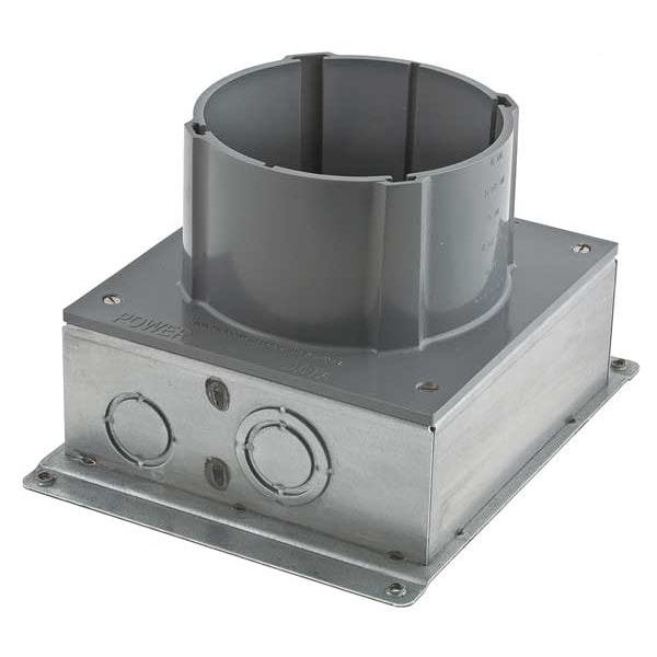 Floor Box, PVC, Steel, Opening Size 6 in, Opening Shape Round, Number of Gangs 2, Hole Dia. 5 in, Length 7 1/2 in, Width 7 3/8 in, Height 6 in, Capacity 175.7 cu in, Standards cULus Listed, UL 514