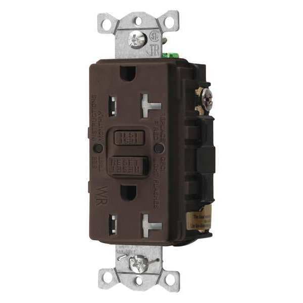 GFCI Receptacle, Connection Orientation Straight, Cover Type No Cover, Current Rating 20 A, GFCI Yes, Grounding Grounded, Housing Color Brown, Housing Material Zytel 101, Mount Type Flush, NEMA Enclosure Rating 1, NEMA Receptacle Configuration 5-20R, Number of Gangs 1, Number of Poles 2, Number of Wires 3, Phase Single, Polarized Yes, Receptacle Type Duplex, Resistance Properties Tamper Resistant, Weather Resistant, Standards NEC, Voltage Rating 125V AC, Wire Connection Type Screw Terminals