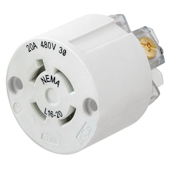 Watertight Plug,16-20r,Repl Int, Current Rating 20 A, For Use With Connector, Receptacle, Housing Material Nylon, NEMA Receptacle Configuration L16-20R, Resistance Properties Heat Resistant, Voltage Rating 480V AC, Standards ANSI, NEMA WD-1 and WD-6, Blade Material Nickel-Plated Brass, Color White, Contact Material Brass, Overall Height 1.9 in, Overall Width 4 in