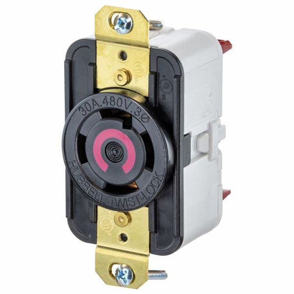 Locking Receptacle, L16-30R, 30 A, 480V AC, Three Phase, 3 Pole, Flush Mount, Black