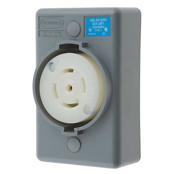 The HUBBELL 30A Locking Receptacle L21-30R is a surface mount, twist-lock receptacle suitable for installation in dry, indoor locations. It supports three-phase power at 120/208V AC with a current rating of 30 amps and accommodates up to five wires and four poles. The device features a shrouded housing made from impact- and corrosion-resistant Valox thermoplastic, with a housing constructed from Valox thermoplastic rated for impact and corrosion resistance.