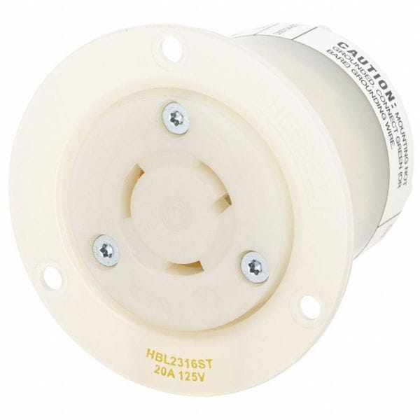Locking Receptacle, Connection Orientation Straight, Current Rating 20 A, Flange Type Non-Flanged, Housing Color White, Housing Material Nylon, NEMA Enclosure Rating 1, NEMA Receptacle Configuration L5-20R, Number of Gangs 1, Number of Poles 2, Number of Wires 3, Phase Single, Polarized Yes, Shrouded Yes, Voltage Rating 125V AC, AFCI No, Contact Material Copper, Cover Type No Cover, Face Diameter 2.88 in, Flange Diameter 2.04 in, Grounding Grounded