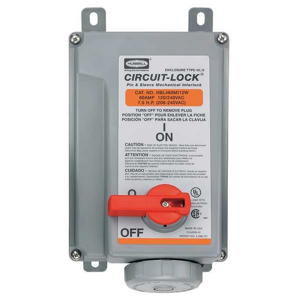 Unfused Circuit-Lock® Pin and Sleeve Mechanical Interlocks - The National Electrical Code (NEC®) requires a separate disconnect means within sight of all motor loads. The NEC requires the disconnecting means in a motor-circuit be listed as “Suitable as Motor Disconnect” if the motor is rated greater than 2 HP. Hubbell’s revolutionary Circuit-Lock interlock incorporates the disconnect switch and receptacle in one compact, non-metallic and economical unit. Removing the plug and locking it out provides a visual means of verifying equipment has been disconnected. All Circuit-Lock mechanical interlocks can be locked out as a method of compliance with the OSHA Lockout/Tagout regulation. The switch cannot be turned ON until the plug is completely engaged, and the plug cannot be removed until the switch is turned OFF. At the same time, it eliminates the possibility of making or breaking the circuit under load or making a casual or “lazy” connection. The non-metallic enclosure can be connected to the metallic conduit and not interfere with the ground continuity. In addition, these horsepower rated units are durable, watertight and easy to install. And they are compatible with IEC 60309-2 plugs. These Circuit-Lock units are available in 20, 30, 60 and 100A models, and in 3, 4 and 5 wire configurations that are designed to the IEC 60309-1 and 60309-2 standards. Hubbell’s Circuit-Lock Mechanical Interlocks are also available in “Reverse Service” versions. These units incorporate the disconnect switch and reverse service receptacle (inlet) in one compact, non-metallic and economical unit. These units are available in 30, 60 and 100A models, 4 wire configurations.