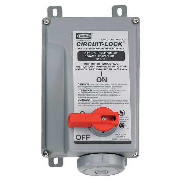 The HUBBELL Mechanical Interlock, 600VAC, 100A is a mechanically interlocked pin and sleeve device rated for use in indoor and outdoor environments. This unit integrates a disconnect switch with an IEC receptacle in a non-metallic housing, includes a feature that allows observation of plug removal. It features a lockable handle compatible with lockout/tagout procedures and incorporates a mechanism to restrict circuit engagement unless the plug is fully inserted. The device supports three-phase operation at up to 600V AC and 100A, accommodating #3 AWG to #1/0 AWG copper wire.
