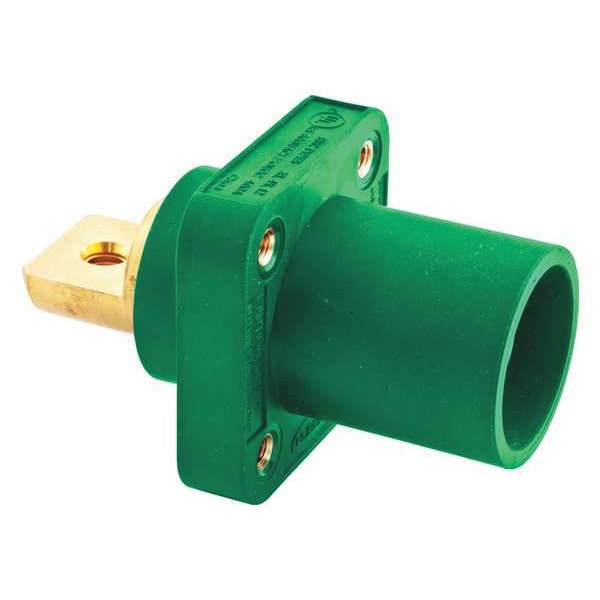 The HUBBELL Series 16 Single Pole Male Receptacle is rated for use in applications requiring up to 400A electrical connections, supporting up to 400A and rated for 600V AC or 250V DC. This straight connection device features a taper nose end type; mates with corresponding female connectors and is suitable for use with #4 AWG to 4/0 AWG wire sizes. The receptacle includes a thermoplastic elastomer housing and brass conductor contacts, compatible with bus bar mounting; intended for indoor use in dry conditions unless otherwise protected.