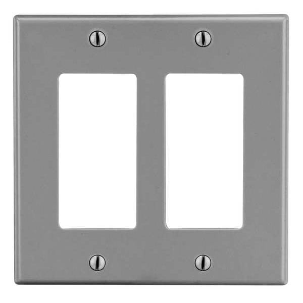 The HUBBELL Rocker Wall Plate is a 2-gang, non-metallic wall plate compatible with decorator-style rocker switches. Made of polycarbonate plastic, it features a smooth satin finish and standard size dimensions for coverage over standard box openings. The plate is suitable for vertical mounting and includes two switch openings.