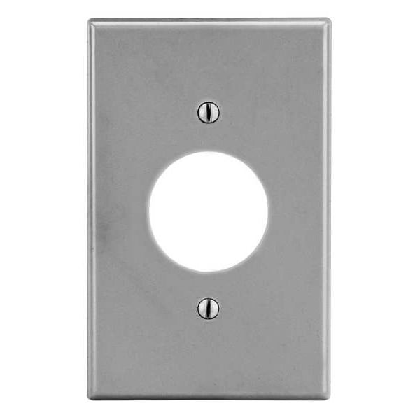 The HUBBELL Single Receptacle Wall Plate is a non-metallic, 1-gang wall plate intended for use with single outlets. Made of polycarbonate plastic, it features a smooth satin finish and provides extra coverage to conceal rough box openings. The plate includes a 1.40-inch circular opening compatible with standard single receptacles and mounts vertically using screws.