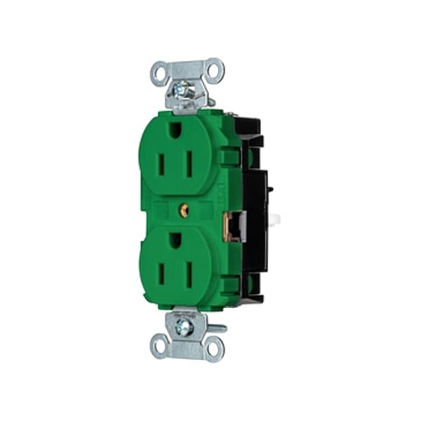 Receptacle, Connection Orientation Straight, Cover Type No Cover, Current Rating 15 A, GFCI No, Grounding Grounded, Hazardous Location Specification Not Applicable, Housing Color Green, Housing Material Thermoplastic, Mount Type Surface, NEMA Enclosure Rating 1, NEMA Receptacle Configuration 5-15R, Number of Gangs 1, Number of Poles 2, Number of Wires 3, Phase Single, Polarized Yes, Receptacle Type Duplex, Resistance Properties Tamper Resistant