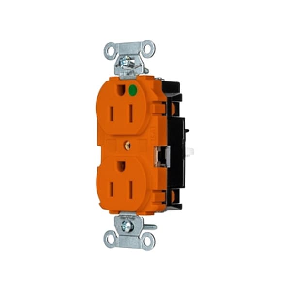 Receptacle, Connection Orientation Straight, Cover Type No Cover, Current Rating 15 A, GFCI No, Grounding Grounded, Hazardous Location Specification Not Applicable, Housing Color Orange, Housing Material Thermoplastic, Mount Type Surface, NEMA Enclosure Rating 1, NEMA Receptacle Configuration 5-15R, Number of Gangs 1, Number of Poles 2, Number of Wires 3, Phase Single, Polarized Yes, Receptacle Type Duplex, Resistance Properties Tamper Resistant