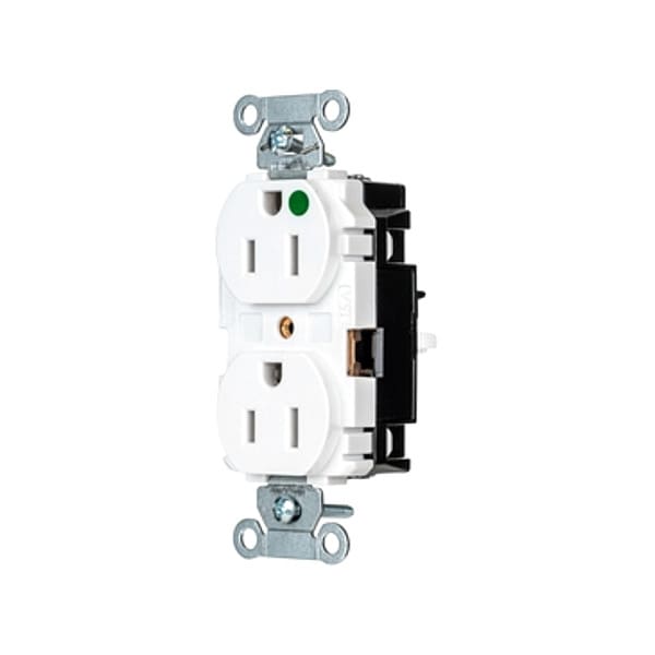 The HUBBELL Duplex Straight Blade Receptacle is a hospital grade, tamper resistant electrical outlet intended for indoor use in dry locations. It features a screwless EdgeConnectTM termination system with tool-free wire insertion.