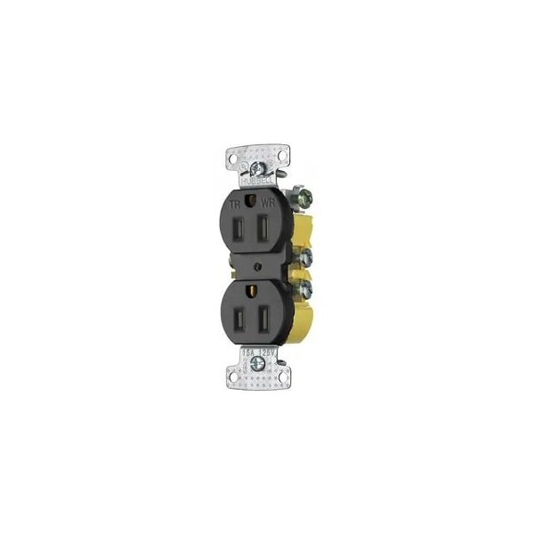 Receptacle, Connection Orientation Straight, Cover Type No Cover, Current Rating 15 A, GFCI No, Grounding Grounded, Hazardous Location Specification Not Applicable, Housing Color Black, Housing Material Thermoplastic, Mount Type Surface, NEMA Enclosure Rating 1, NEMA Receptacle Configuration 5-15R, Number of Gangs 1, Number of Poles 2, Number of Wires 3, Phase Single, Polarized Yes, Receptacle Type Decorator Duplex, Resistance Properties Tamper Resistant