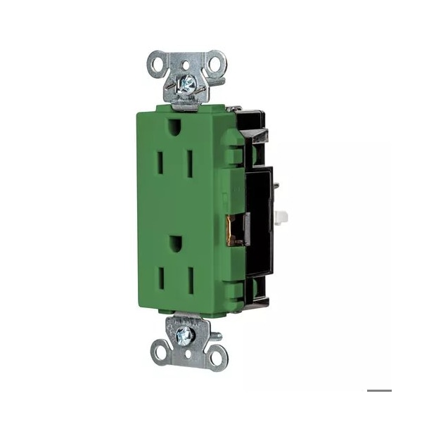 Receptacle, Connection Orientation Straight, Cover Type No Cover, Current Rating 15 A, GFCI No, Grounding Grounded, Hazardous Location Specification Not Applicable, Housing Color Green, Housing Material Thermoplastic, Mount Type Surface, NEMA Enclosure Rating 1, NEMA Receptacle Configuration 5-15R, Number of Gangs 1, Number of Poles 2, Number of Wires 3, Phase Single, Polarized Yes, Receptacle Type Decorator Duplex, Resistance Properties Tamper Resistant