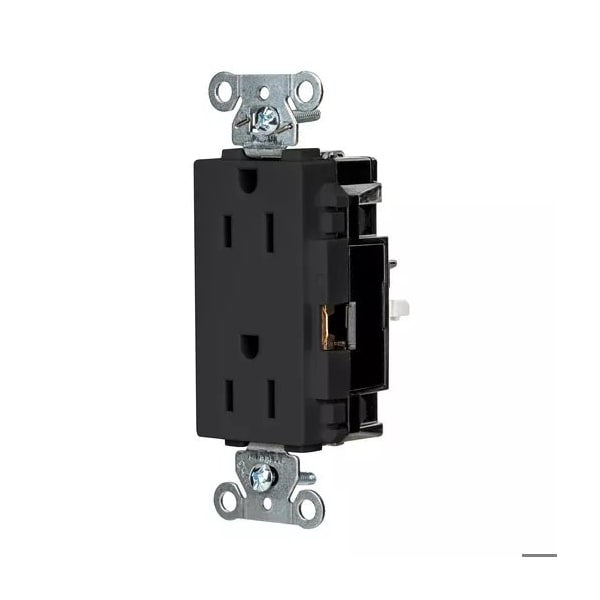 Receptacle, Connection Orientation Straight, Cover Type No Cover, Current Rating 15 A, GFCI No, Grounding Grounded, Hazardous Location Specification Not Applicable, Housing Color Black, Housing Material Thermoplastic, Mount Type Surface, NEMA Enclosure Rating 1, NEMA Receptacle Configuration 5-15R, Number of Gangs 1, Number of Poles 2, Number of Wires 3, Phase Single, Polarized Yes, Receptacle Type Decorator Duplex, Resistance Properties Tamper Resistant
