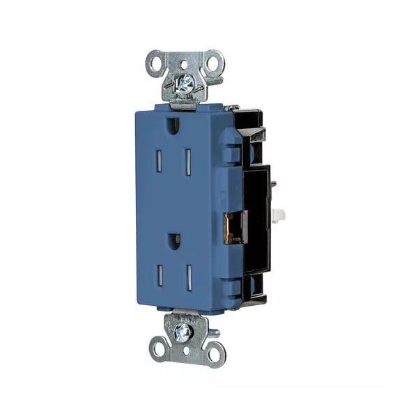 Receptacle, Connection Orientation Straight, Cover Type No Cover, Current Rating 15 A, GFCI No, Grounding Grounded, Hazardous Location Specification Not Applicable, Housing Color Blue, Housing Material Thermoplastic, Mount Type Surface, NEMA Enclosure Rating 1, NEMA Receptacle Configuration 5-15R, Number of Gangs 1, Number of Poles 2, Number of Wires 3, Phase Single, Polarized Yes, Receptacle Type Decorator Duplex, Resistance Properties Tamper Resistant