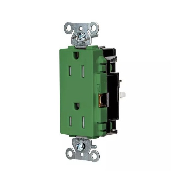 Receptacle, Connection Orientation Straight, Cover Type No Cover, Current Rating 15 A, GFCI No, Grounding Grounded, Hazardous Location Specification Not Applicable, Housing Color Green, Housing Material Thermoplastic, Mount Type Surface, NEMA Enclosure Rating 1, NEMA Receptacle Configuration 5-15R, Number of Gangs 1, Number of Poles 2, Number of Wires 3, Phase Single, Polarized Yes, Receptacle Type Decorator Duplex, Resistance Properties Tamper Resistant