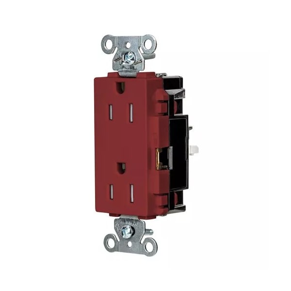 Receptacle, Connection Orientation Straight, Cover Type No Cover, Current Rating 15 A, GFCI No, Grounding Grounded, Hazardous Location Specification Not Applicable, Housing Color Red, Housing Material Thermoplastic, Mount Type Surface, NEMA Enclosure Rating 1, NEMA Receptacle Configuration 5-15R, Number of Gangs 1, Number of Poles 2, Number of Wires 3, Phase Single, Polarized Yes, Receptacle Type Decorator Duplex, Resistance Properties Tamper Resistant