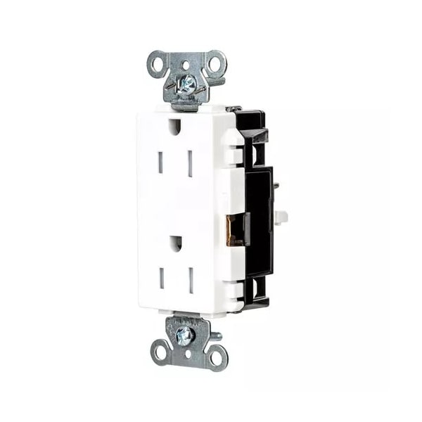 Receptacle, Connection Orientation Straight, Cover Type No Cover, Current Rating 15 A, GFCI No, Grounding Grounded, Hazardous Location Specification Not Applicable, Housing Color White, Housing Material Thermoplastic, Mount Type Surface, NEMA Enclosure Rating 1, NEMA Receptacle Configuration 5-15R, Number of Gangs 1, Number of Poles 2, Number of Wires 3, Phase Single, Polarized Yes, Receptacle Type Decorator Duplex, Resistance Properties Tamper Resistant