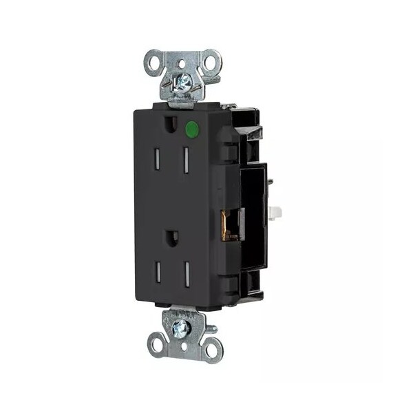 Receptacle, Connection Orientation Straight, Cover Type No Cover, Current Rating 15 A, GFCI No, Grounding Grounded, Hazardous Location Specification Not Applicable, Housing Color Black, Housing Material Thermoplastic, Mount Type Surface, NEMA Enclosure Rating 1, NEMA Receptacle Configuration 5-15R, Number of Gangs 1, Number of Poles 2, Number of Wires 3, Phase Single, Polarized Yes, Receptacle Type Decorator Duplex, Resistance Properties Tamper Resistant