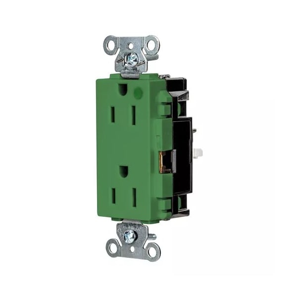 Receptacle, Connection Orientation Straight, Cover Type No Cover, Current Rating 15 A, GFCI No, Grounding Grounded, Hazardous Location Specification Not Applicable, Housing Color Green, Housing Material Thermoplastic, Mount Type Surface, NEMA Enclosure Rating 1, NEMA Receptacle Configuration 5-15R, Number of Gangs 1, Number of Poles 2, Number of Wires 3, Phase Single, Polarized Yes, Receptacle Type Decorator Duplex, Resistance Properties Chemical Resistant, Corrosion Resistant, Impact Resistant