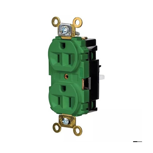 Receptacle, Connection Orientation Straight, Cover Type No Cover, Current Rating 15 A, GFCI No, Grounding Grounded, Hazardous Location Specification Not Applicable, Housing Color Green, Housing Material Thermoplastic, Mount Type Surface, NEMA Enclosure Rating 1, NEMA Receptacle Configuration 5-15R, Number of Gangs 1, Number of Poles 2, Number of Wires 3, Phase Single, Polarized Yes, Receptacle Type Duplex, Resistance Properties Tamper Resistant