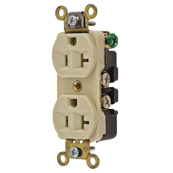 Receptacle, Connection Orientation Straight, Cover Type No Cover, Current Rating 20 A, GFCI No, Grounding Grounded, Housing Color Ivory, Housing Material Nylon, Mount Type Flush, NEMA Enclosure Rating 1, NEMA Receptacle Configuration 5-20R, Number of Gangs 1, Number of Poles 2, Number of Wires 3, Phase Single, Polarized Yes, Receptacle Type Duplex, Standards CSA Certified C22.2 No. 42 File 285, Federal Specification W-C-596G, NEMA WD-6, UL 498 File E2186, Voltage Rating 125V AC